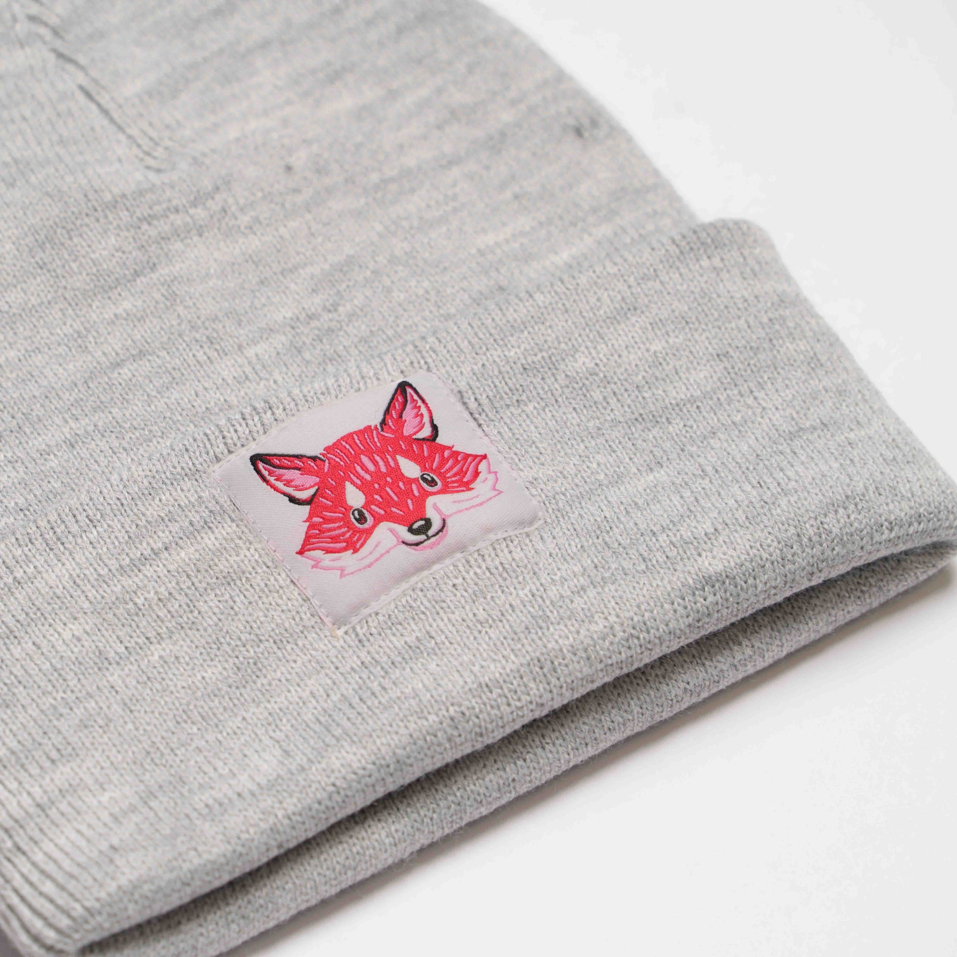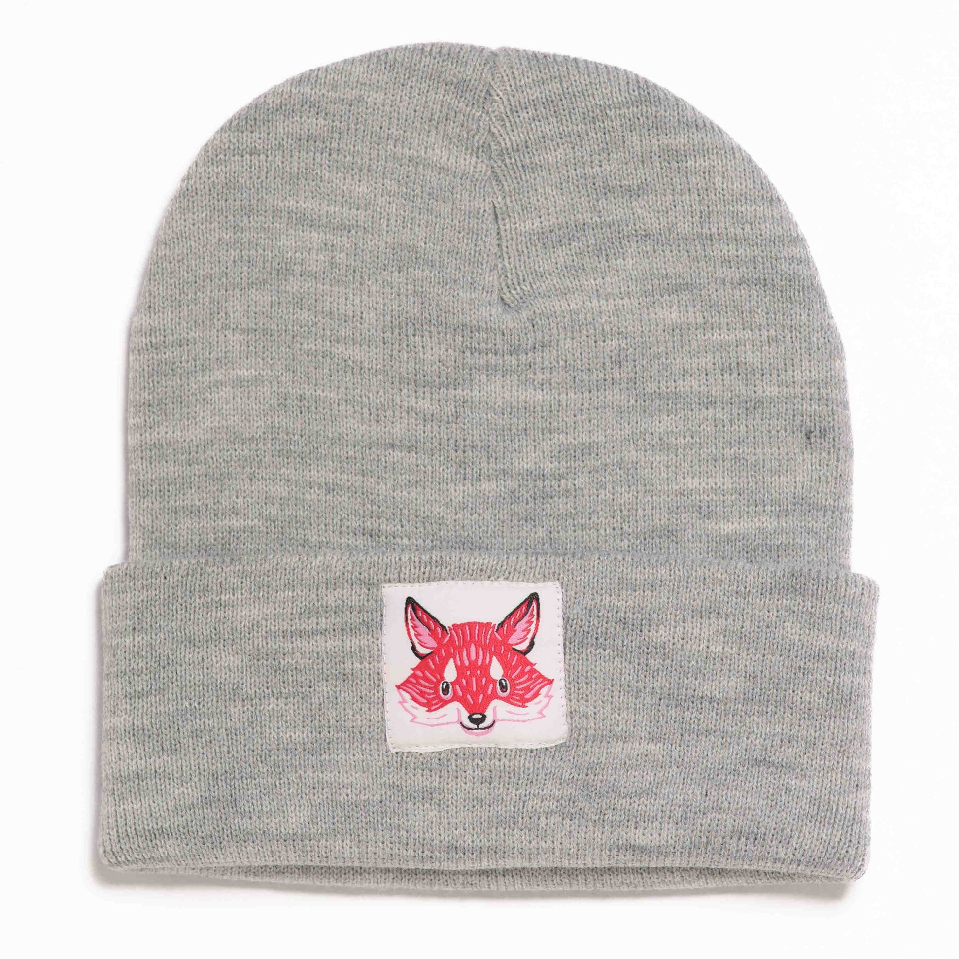Fox patch on a light grey speckled beanie.